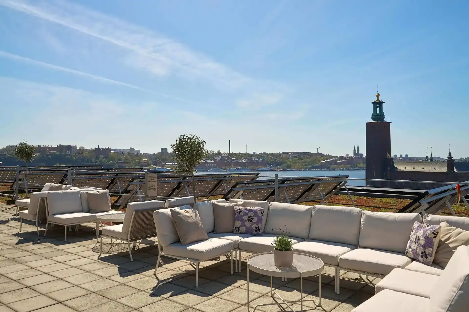 Det störta konferensrummet är en generös takterrass med en oförglömlig utsikt över Stockholm. Här kan ca 50 personer mingla under en nätverksträff.